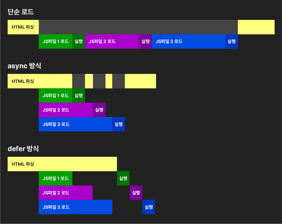 - 스크립트의 크기가 클 경우 그 아래 요소들의 로드가 지연됨 - 동기적 로드