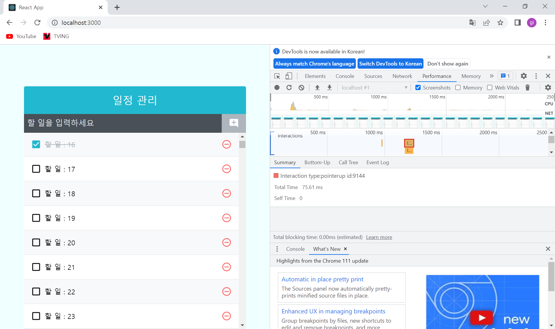 .TodoListItem-virtualized { &:nth-child(even) { background-color: #f8f9fa; } & + & { border-top: 1px solid #dee2e6; } } .TodoListItem{ padding: 1rem; display: flex; align-items: center; .checkbox{ cursor: pointer; flex : 1; display: flex; align-items: center; svg { font-size: 1.5rem; } .text { margin-left: 0.5rem; flex : 1 } &.checked { svg{ color : #22b8cf; } .text{ color :#adb5bd; text-decoration: line-through; } } } .remove { display: flex; align-items: center; font-size: 1.5rem; color:#ff6b6b; cursor: pointer; &.hover { color :#ff8787; } } }Final , 성능 측정